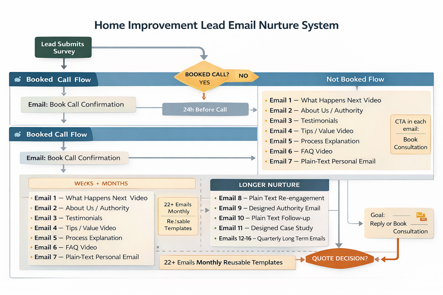 This workflow maps the complete client journey — from initial lead submission to booked call, follow-up automation, and long-term nurture. Every trigger, tag, and email sequence is intentionally structured to increase conversions.